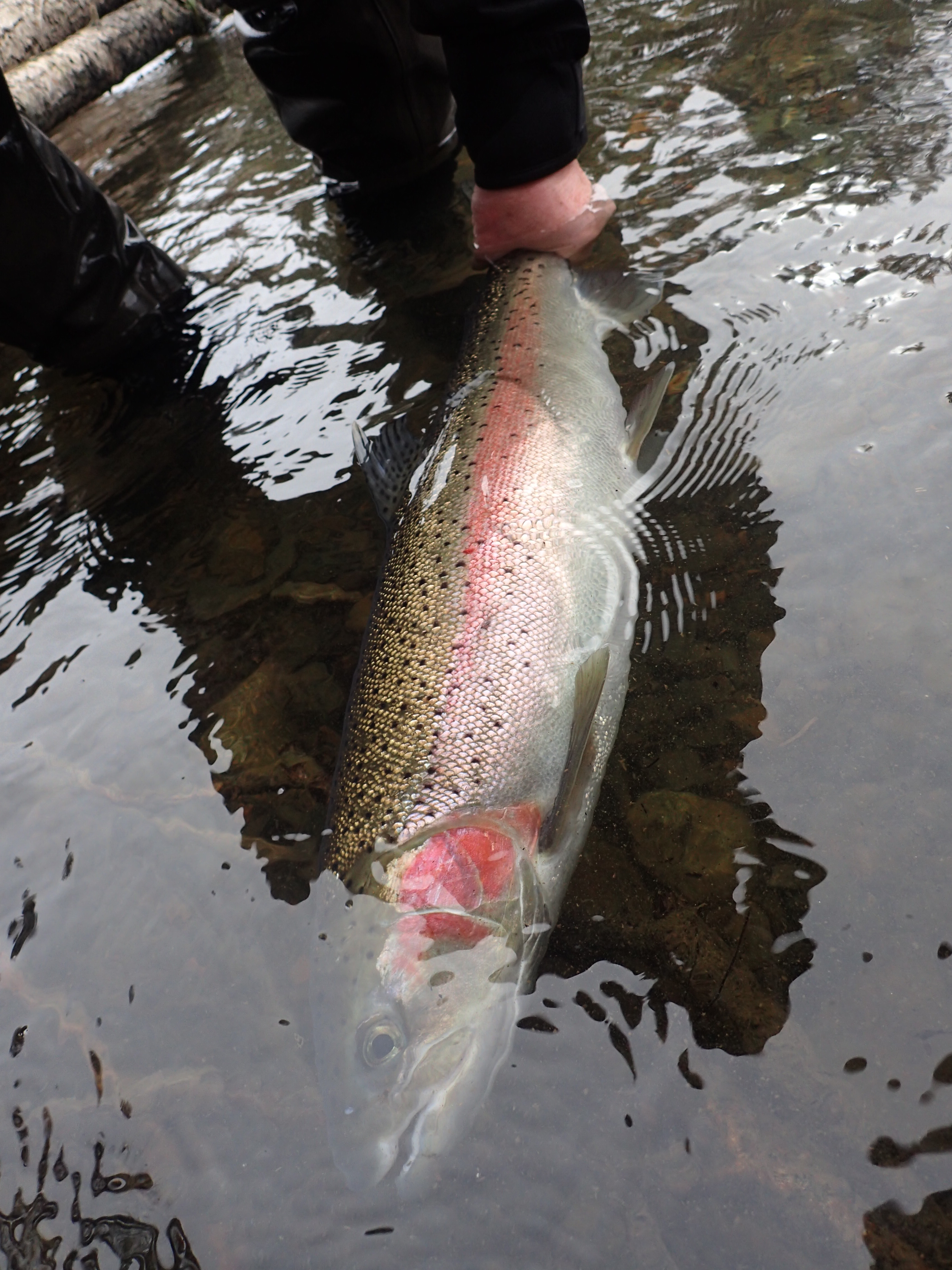 Best way to handle catch and release is with a Lucky Strike Salmon rubber net. Thank goodness the net collapse as hiking through the trail can be a challenge. A lot of the stress can be applied to the steelhead when the angler is trying to land the fish. At this time of the season, we are catching a few kelts. Kelts is a spawned out steelhead that has survived the spawn and now trying to recover to return to the ocean for a repeat generation. That’s why it ’s important, to be gentle with them as they try to recover. A rubber net allows quick subduing to the fish without removing their protective slime and/or scales. Thus allowing them to relax and recover safely while in the net without over handling. It also helps when you have a buddy net the steelhead for you.