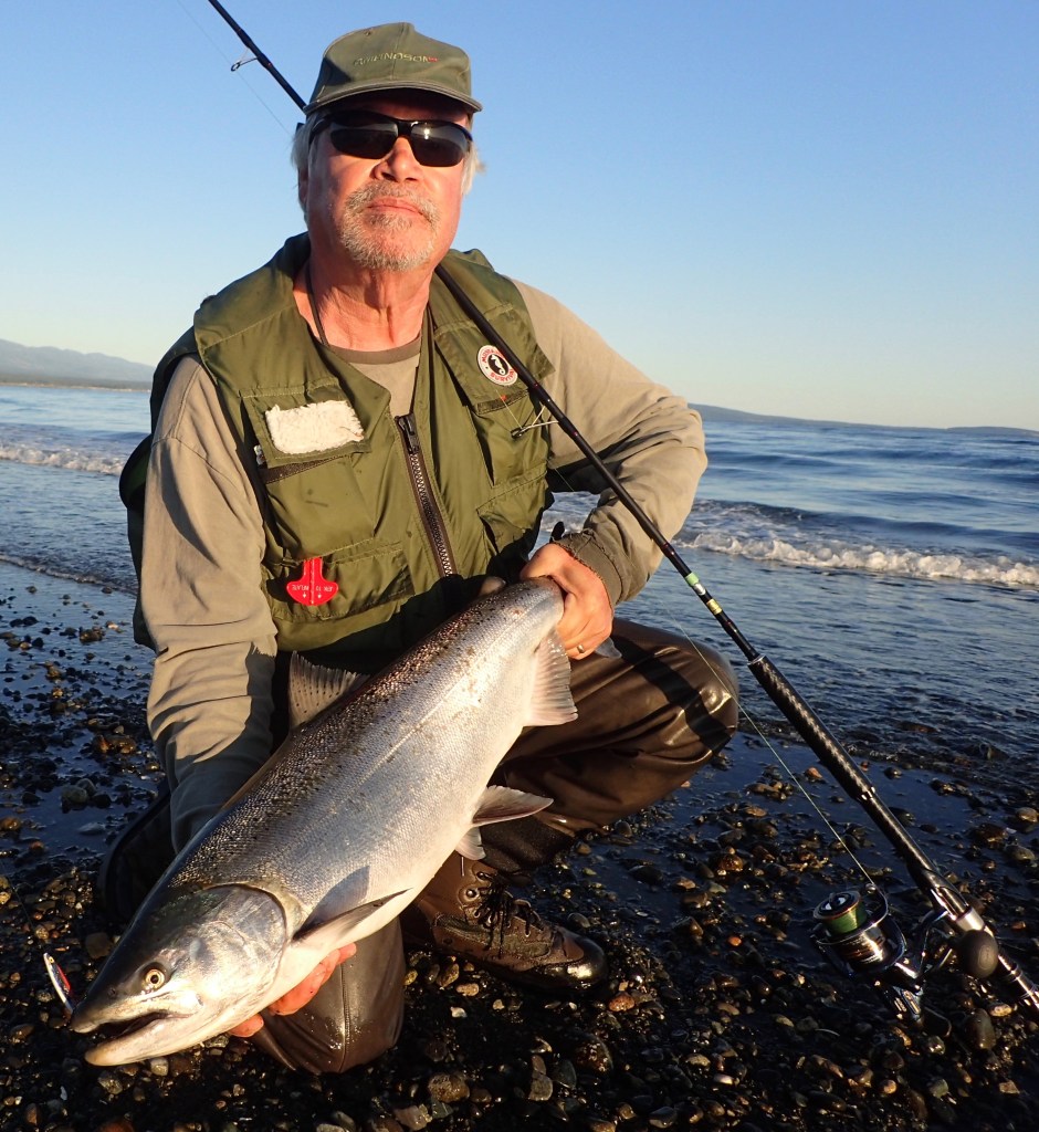 These large salmon are too heavy to be forced to the beach, so netting or tailing them is the best method. Three of the hottest lures were the 3/8 ounce Olympic Tackle squid spinners, the Zzingers, and the Buzzbomb.