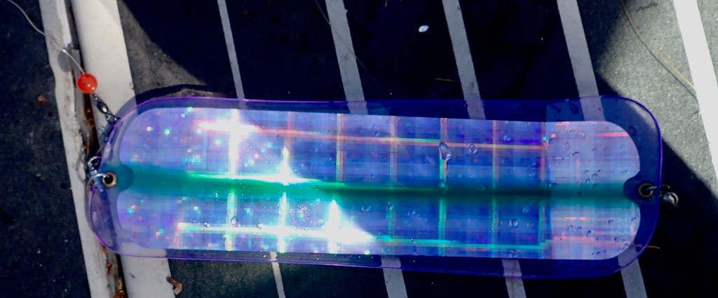 Traditional flashers are 8-11 inches, with slightly tapered boards with opposite bends at each end, causing them to sway back and forth and rotate. A lure that trails behind this motion has erratic action due to the sway. Each side of the flasher has a colour and a reflective surface design. The type of lure, like spoons, bait, hootchies etc., determines the leader’s length to transmit the proper action. A non-action lure like a hootchie or a Bucktail will have a more erratic and wider action path with a flasher using a shorter leader.