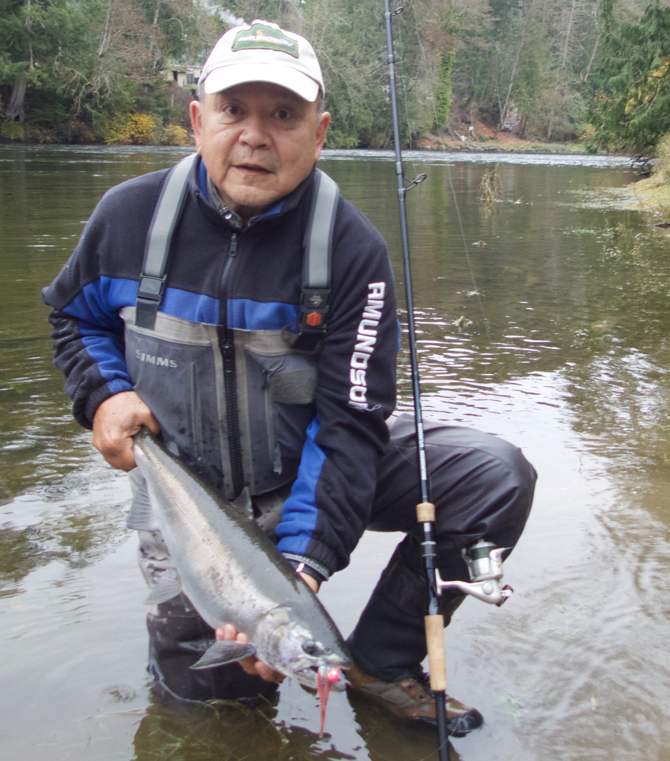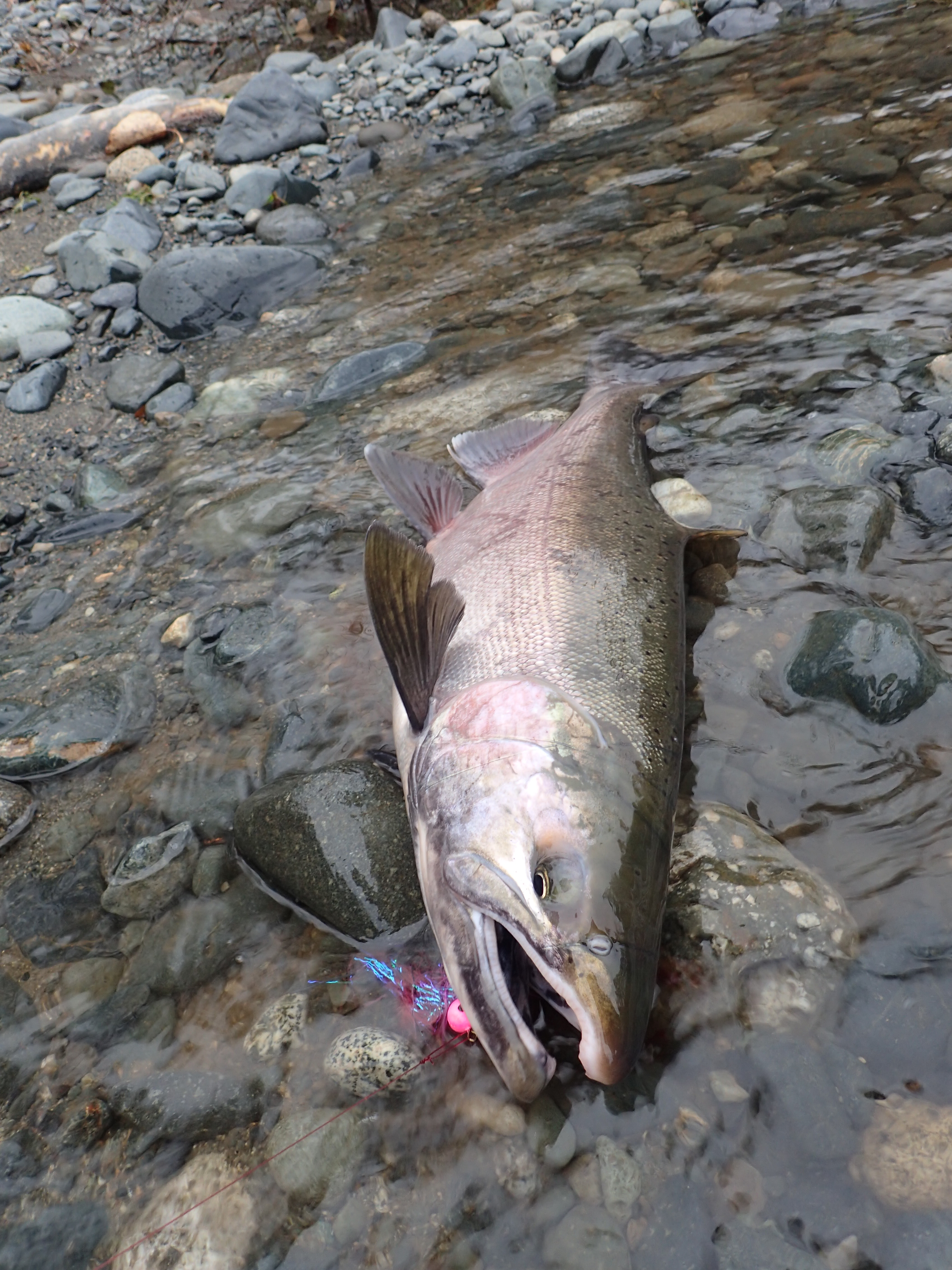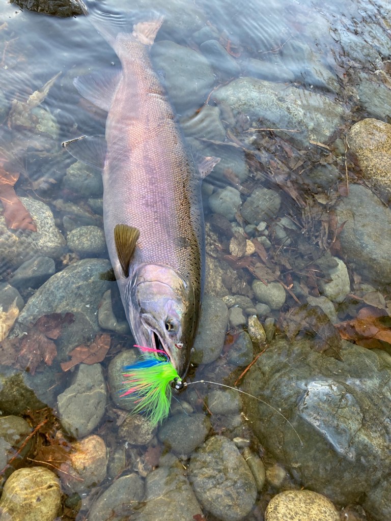 Coho anglers increasingly use the twitching (jigging) technique in slower pools and runs. A 7-9 foot rod, reel loaded with 20lb., or 30 lb. braid and a mono leader. I will cast the jig slightly upriver and let it swing through the current, incidentally lifting it and then allowing it to drop by applying varying 1–2-foot rod twitch, which means raising and dropping the rod tip, creating the slack line. Allowing the slack line to hit the surface without reeling in immediately. That is twitching, and the objective is to lay out a smooth all-over cadence without losing contact with the jig. Once the jig hits the surface, the angler starts the twitch, raising the rod and allowing the jig to drop while retrieving some line. The goal is to move your jig slightly above the fish in a “W” motion. The angler should keep his rod no higher than 45 degrees. It allows the angler room to raise the rod for a hook set quickly.